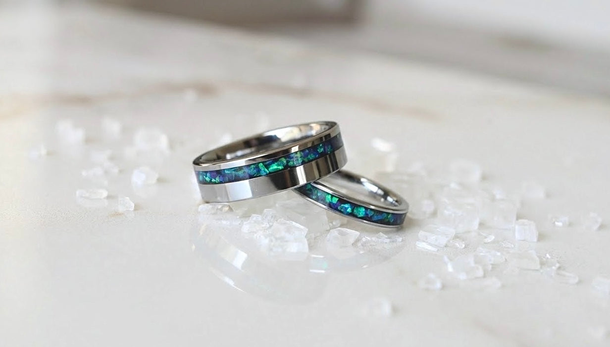 Blue Opal Tungsten Wedding Ring Set, His and Hers, Handmade Jewelry