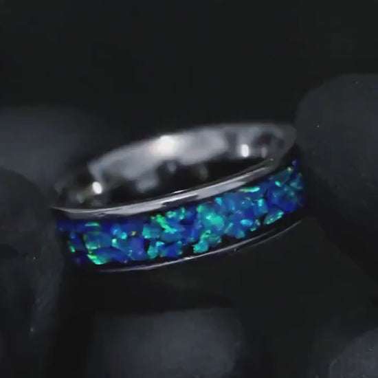 Blue Opal Tungsten Wedding Ring Set, His and Hers, Handmade Jewelry
