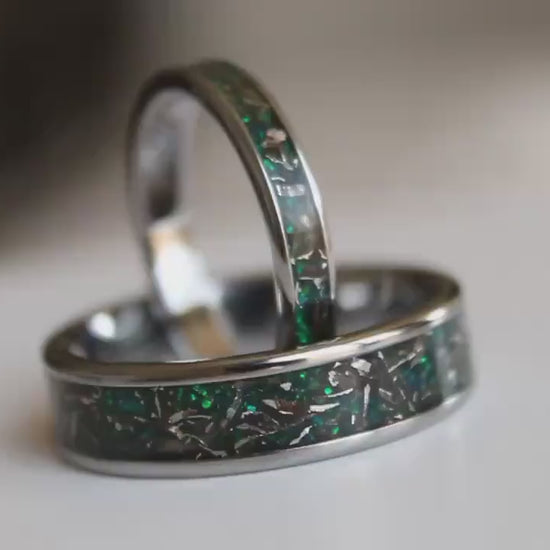 Real meteorite and green opal, tungsten wedding ring set | beautiful & special jewellery | handmade and bespoke wedding ring set