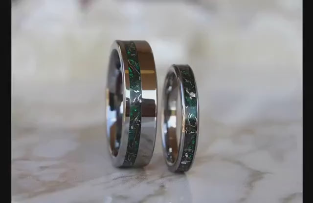 Real Meteorite And Green Opal Tungsten Ring Set, His and Hers Wedding Ring Set