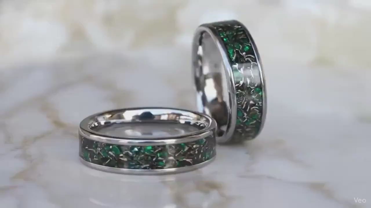 Real meteorite and green opal, tungsten wedding ring set | beautiful & special jewellery | handmade and bespoke wedding ring set