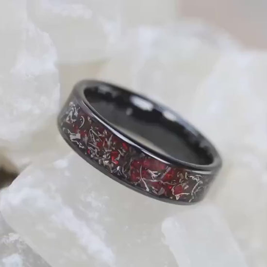 Real Meteorite and Red Opal Titanium Carbide Ring, Unique Black Band