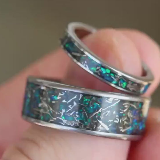 Real meteorite and blue opal tungsten wedding ring set | beautiful & special jewellery | handmade and bespoke wedding ring set