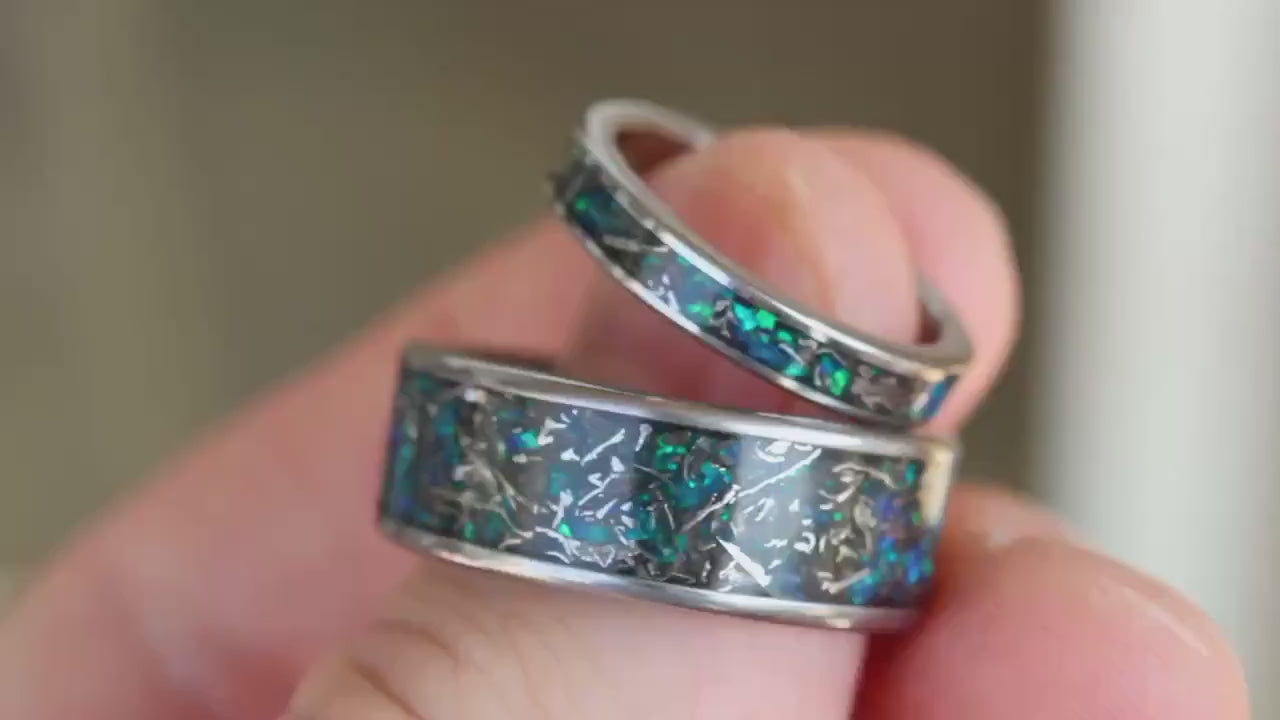 Real Meteorite And Blue Opal Tungsten Wedding Ring Set m