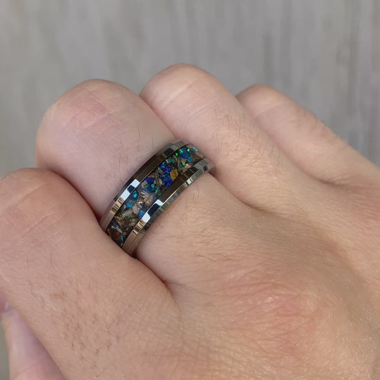 Real dinosaur bone, meteorite and blue opal, tungsten ring