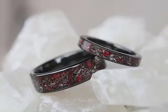Real meteorite and red opal, titanium carbide wedding ring set | beautiful & special jewellery | handmade and bespoke wedding ring set | titanium carbide (ceramic)