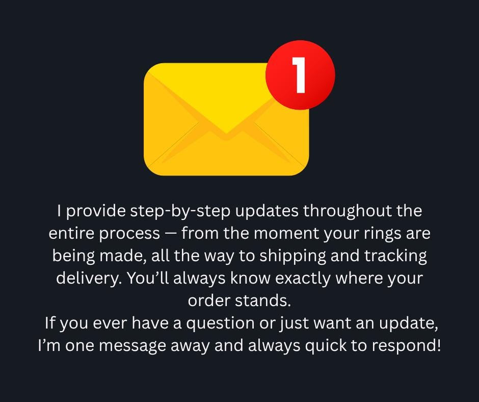 From handcrafting to shipping, we keep you updated at every step. You’ll receive progress updates, shipping confirmations, and tracking details so you can follow your rings’ journey from our workshop to your hands. I’m always one message away with quick, friendly responses.