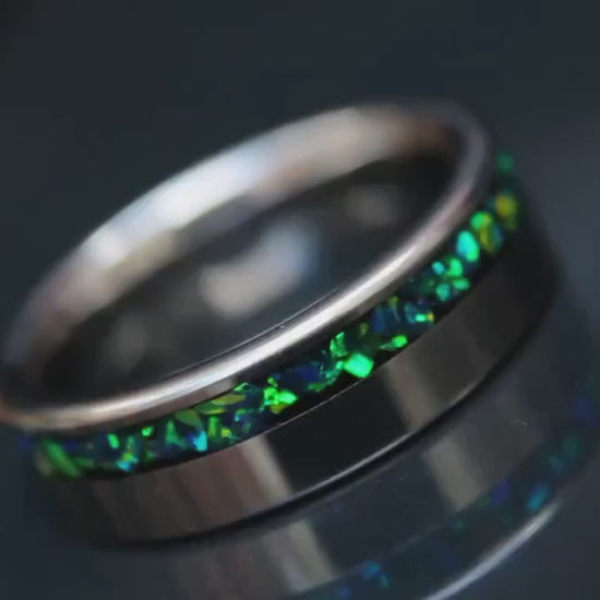 Discover our beautiful and unique handmade wedding ring set featuring a stunning dark green opal with blue flashes 6mm offset inlay ring. Crafted from durable tungsten carbide, it's the perfect choice for your special day. Remember, there's only one us, so make your wedding day even more special with this one-of-a-kind piece.